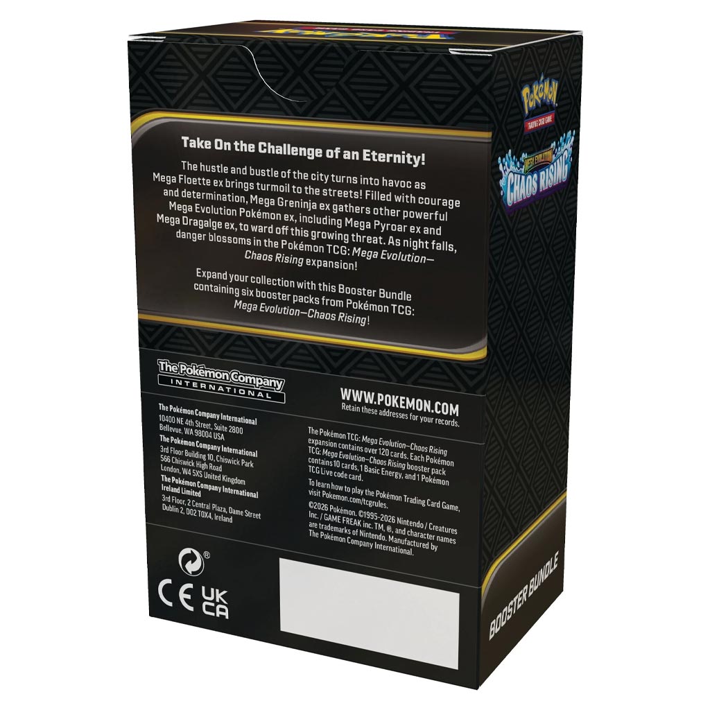 Expande tu colección con el Booster Bundle de la expansión Mega Evolution: Chaos Rising, una opción ideal para quienes buscan abrir múltiples sobres de manera práctica. Esta expansión presenta un entorno lleno de acción donde poderosas Mega Evoluciones entran en escena, ofreciendo nuevas cartas, estrategias y combinaciones para el juego.