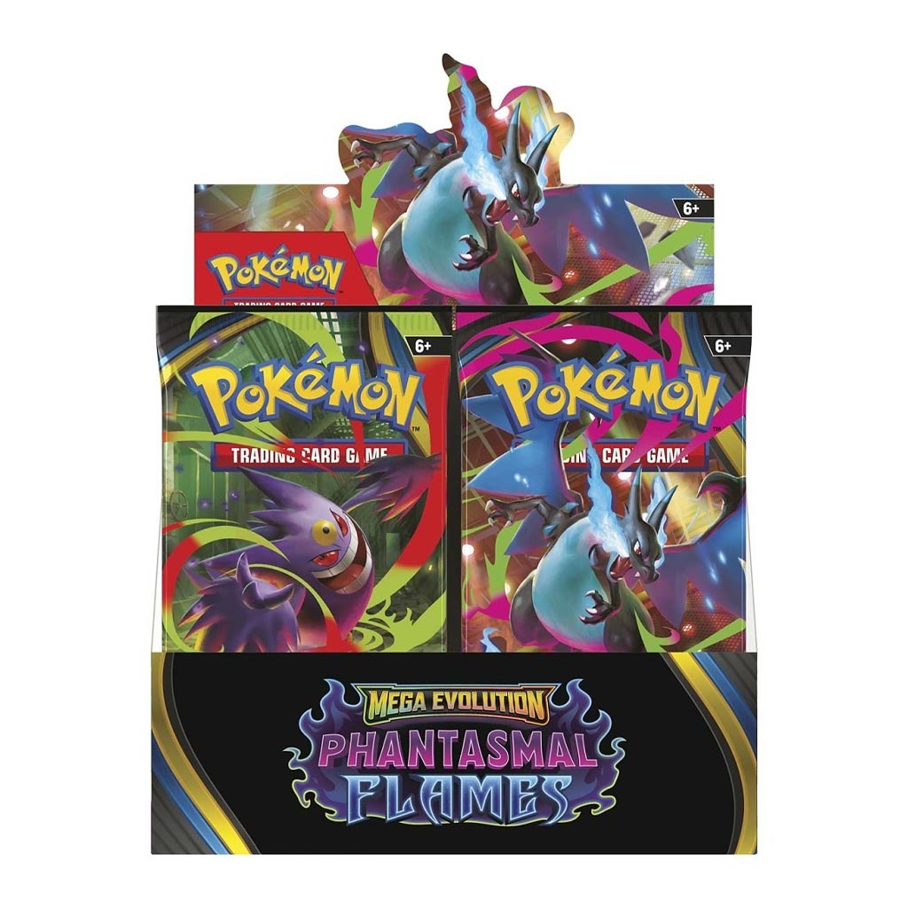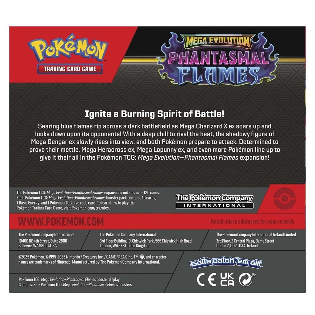 Llamas azules surcan un campo de batalla envuelto en oscuridad mientras Mega Charizard X ex se eleva sobre sus oponentes. Desde las sombras, Mega Gengar ex emerge con una energía helada que rivaliza con el calor de su rival, y ambos Pokémon se preparan para enfrentarse en una batalla legendaria.En la expansión Mega Evolution: Phantasmal Flames, nuevos y poderosos Pokémon ex entran al combate, incluyendo a Mega Heracross ex, Mega Lopunny ex, y muchas más criaturas dispuestas a probar su fuerza y espíritu de lucha.
